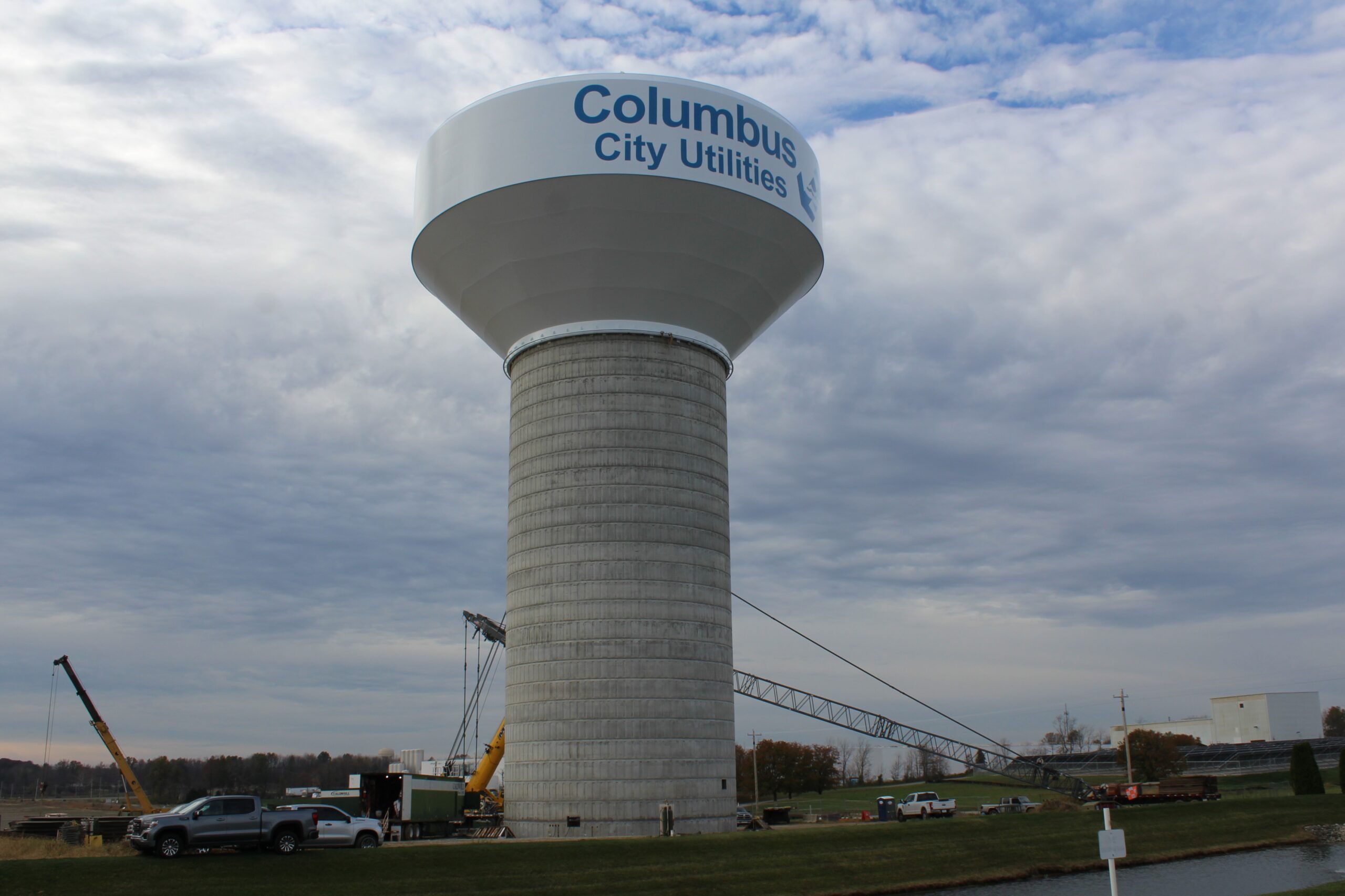 As part of Columbus City Utilities’ ongoing infrastructure improvement activities, the bowl of a new 2-million-gallon elevated water storage tank on Deaver Road was lifted into its final resting spot atop the 166 feet tall concrete and steel base, making the final height over 200 feet. The tank base and bowl were built by Caldwell Tanks LLC. The bowl was lifted on November 9 by 48 hydraulic jacks and took about 5 hours to reach the top of the base. Water to the new storage tank will be supplied by (4) 1,500 gallon per minute booster pumps housed in the base. The tank construction is scheduled to be completed in late April and will go into service in time for peak summer demands. The completion of this tank will increase the total system storage by over 50 percent.